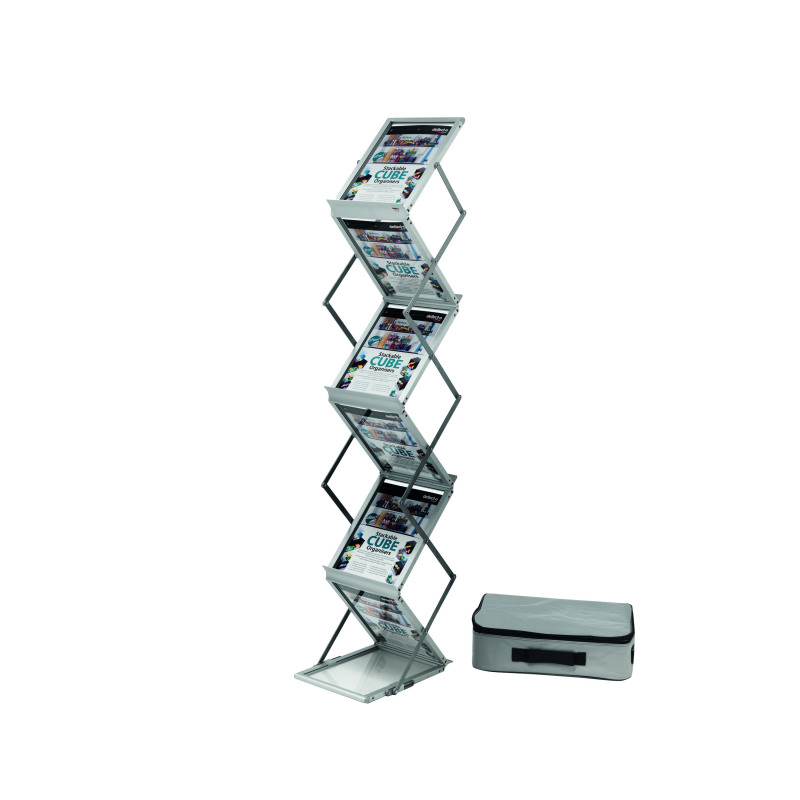 Bring the Deflecto Folding Stand to your next trade fair or exposition, unfold it from the bag and you get a 1500mm tall display stand with six double-sided shelves. You can use it to stock brochures, booklets and leaflets up to A4 size and present them with a professional style to customers and visitors. Then when you are finished, simply fold it down and pack it back into the carry case.