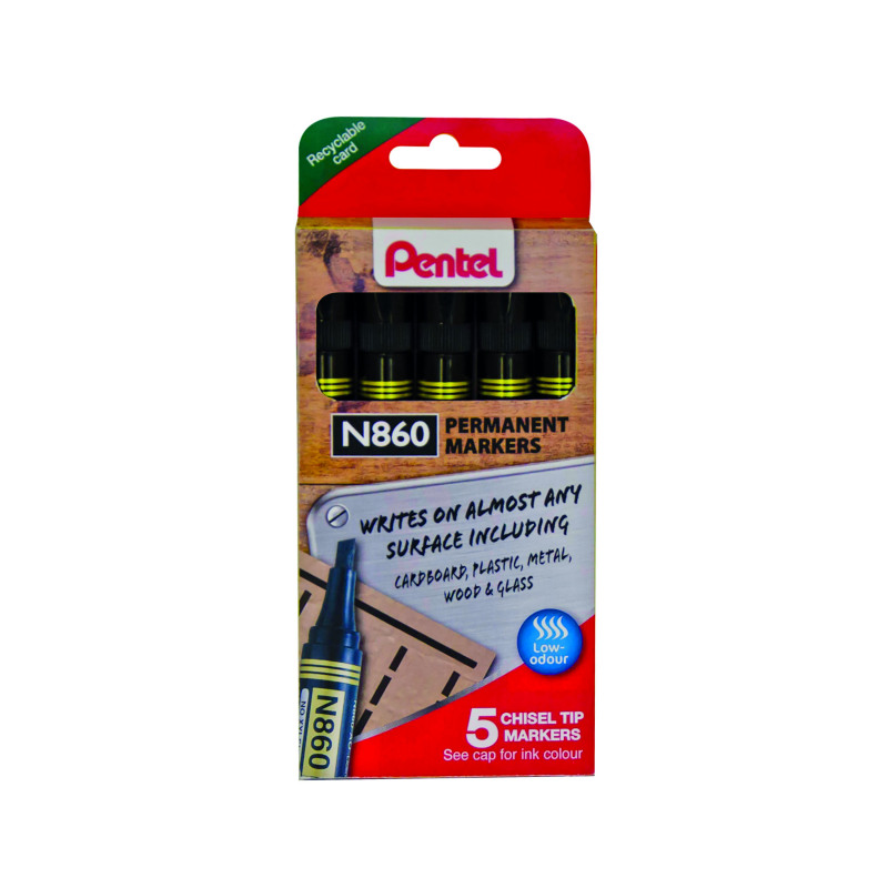 Ideal for everyday use Pentel's N860 Permanent Marker has a chisel tip for an approximate line width of 2.5-7.0mm. It contains bold black ink which is low odour and does not contain xylene or toluene. It is topped with a specially moulded anti-roll cap.