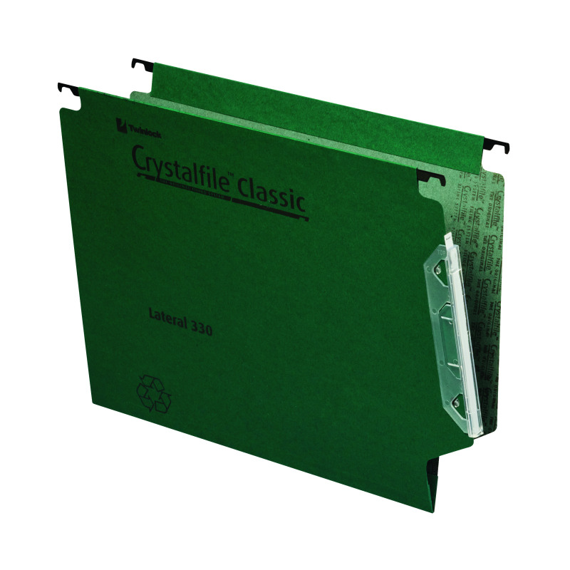 Rexel Crystalfile Classic Lateral Files are made from recycled premium manilla and are supplied complete with tabs and inserts. These expanding files have a 15mm capacity, to store up to 150 sheets of 80gsm A4 or foolscap paper. The files have reinforced bases and strong plastic runners for durable use and are compatible with cupboard rails set 330mm apart. This pack contains 50 green files.